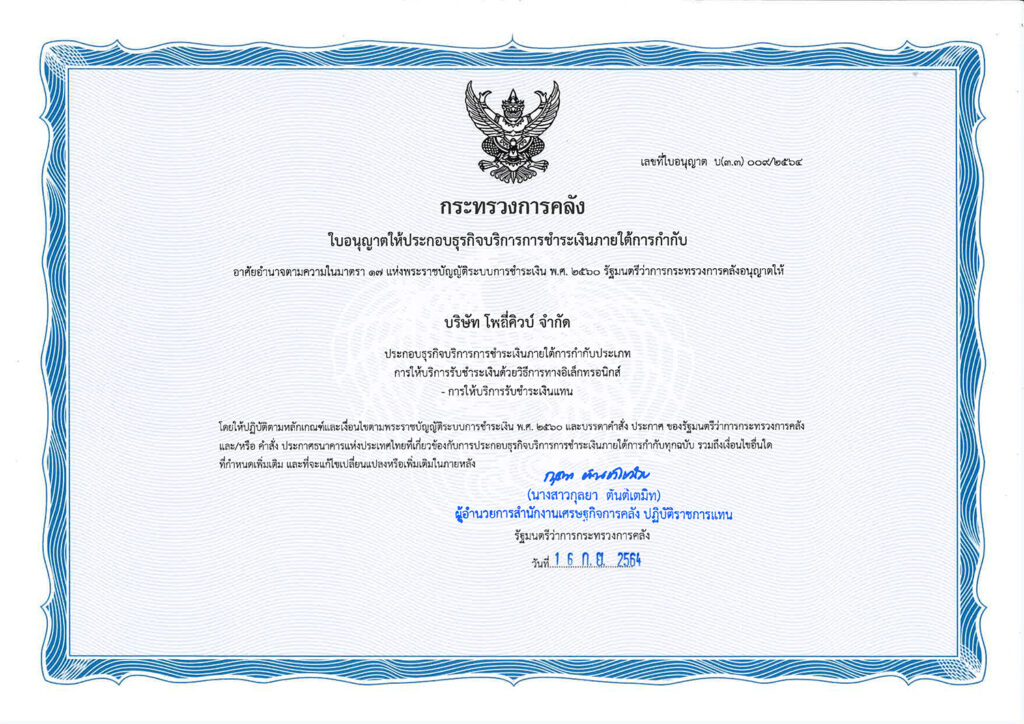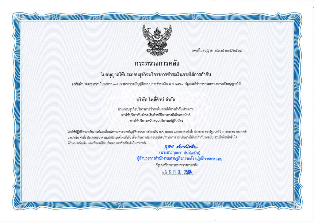 License for Payment Services Business under Supervision, Category: Provision of Electronic Payment Acceptance Services, supervised by the Bank of Thailand.